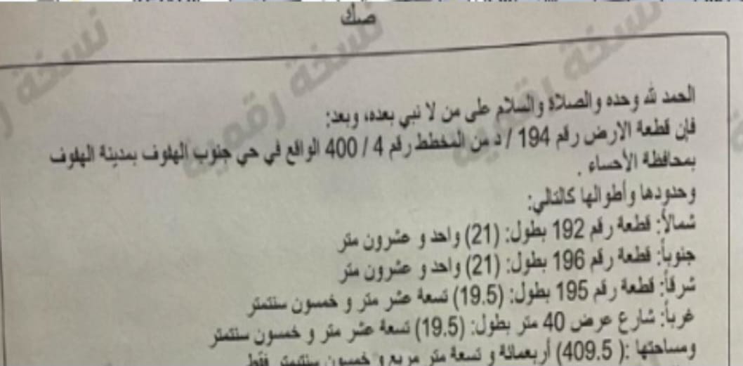 التفاصيل | الحمراء 2 48/هـ | المساحة400م شارع15*15 | السوم510,000.00 25/12/2024 |
