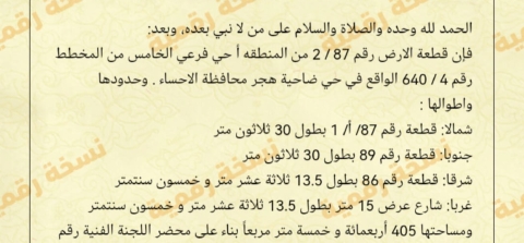 التفاصيل | الضاحية الحي الخامس (640/4) 576/ب | المساحة927م شارع15 شرق | الحد600,000.00 16/02/2026 |