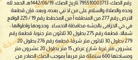 التفاصيل | الخزامى 232/1/ب | المساحة300م شارع18 | على السوم 18/06/2025 |