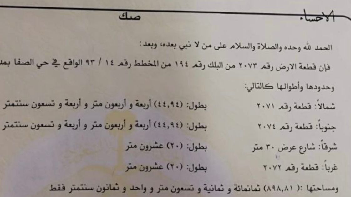 التفاصيل | الصفا ١ (93/14) 1/1183 | المساحة600م شارع40*15 | المتر1,600.00 16/11/2025 |