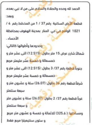 التفاصيل | المنار (1021/4) 2 | المساحة1,509م شارع30*20 | حد المتر1,500.00 11/04/2026 |