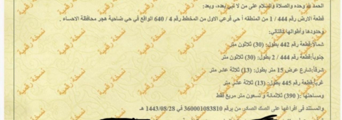 التفاصيل | الضاحية الحي الاول (640/4) 671/ج | المساحة774م شارع15 شرق | الحد600,000.00 16/02/2026 |